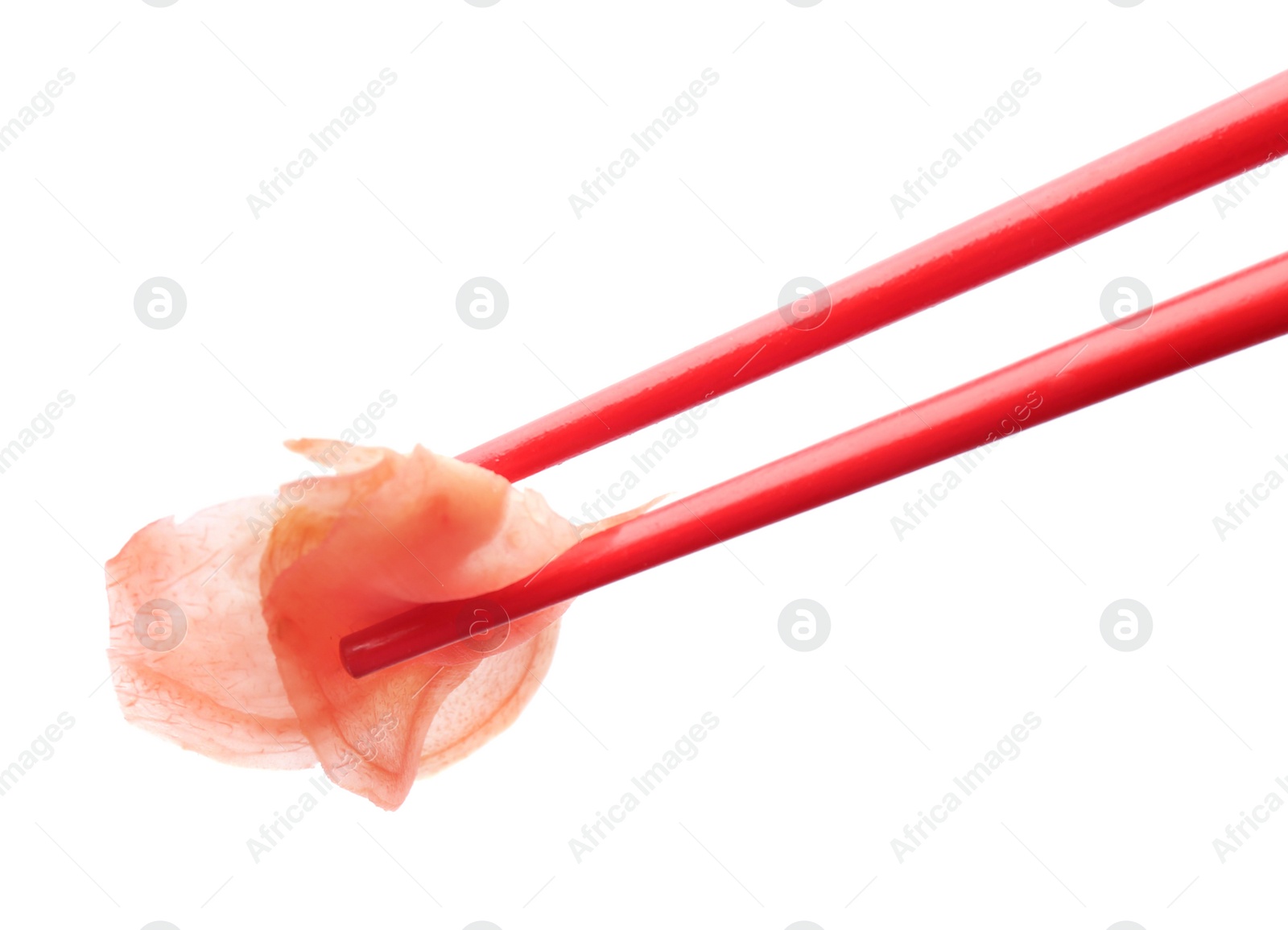 Chopsticks with pickled ginger on white background