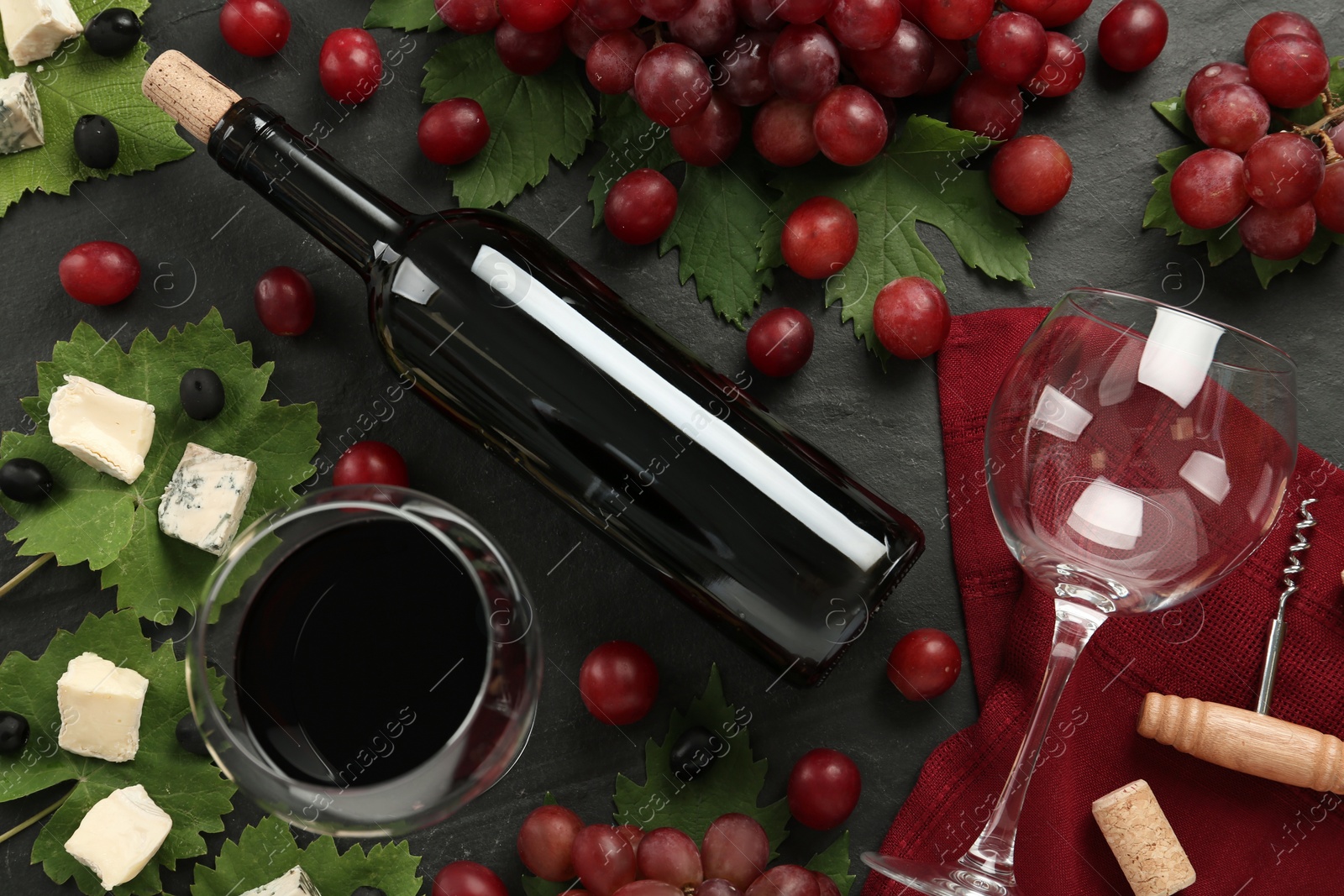 Tasty red wine and snacks on black table, flat lay